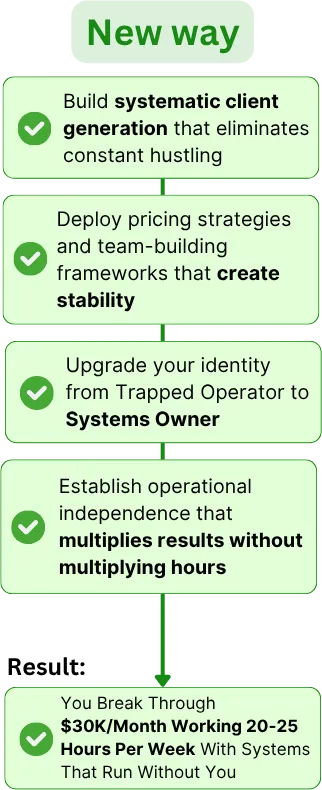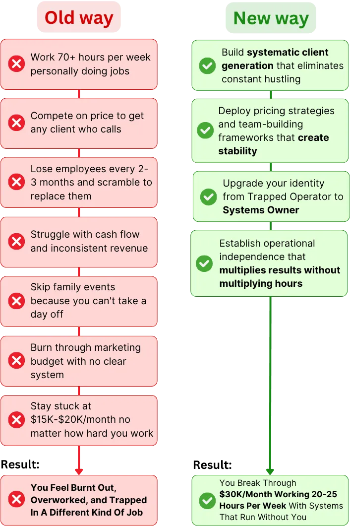 And when you do this, you'll be able to work 15-25 hours per week instead of 70+, while making MORE money every single month and operating with predictable cash flow.